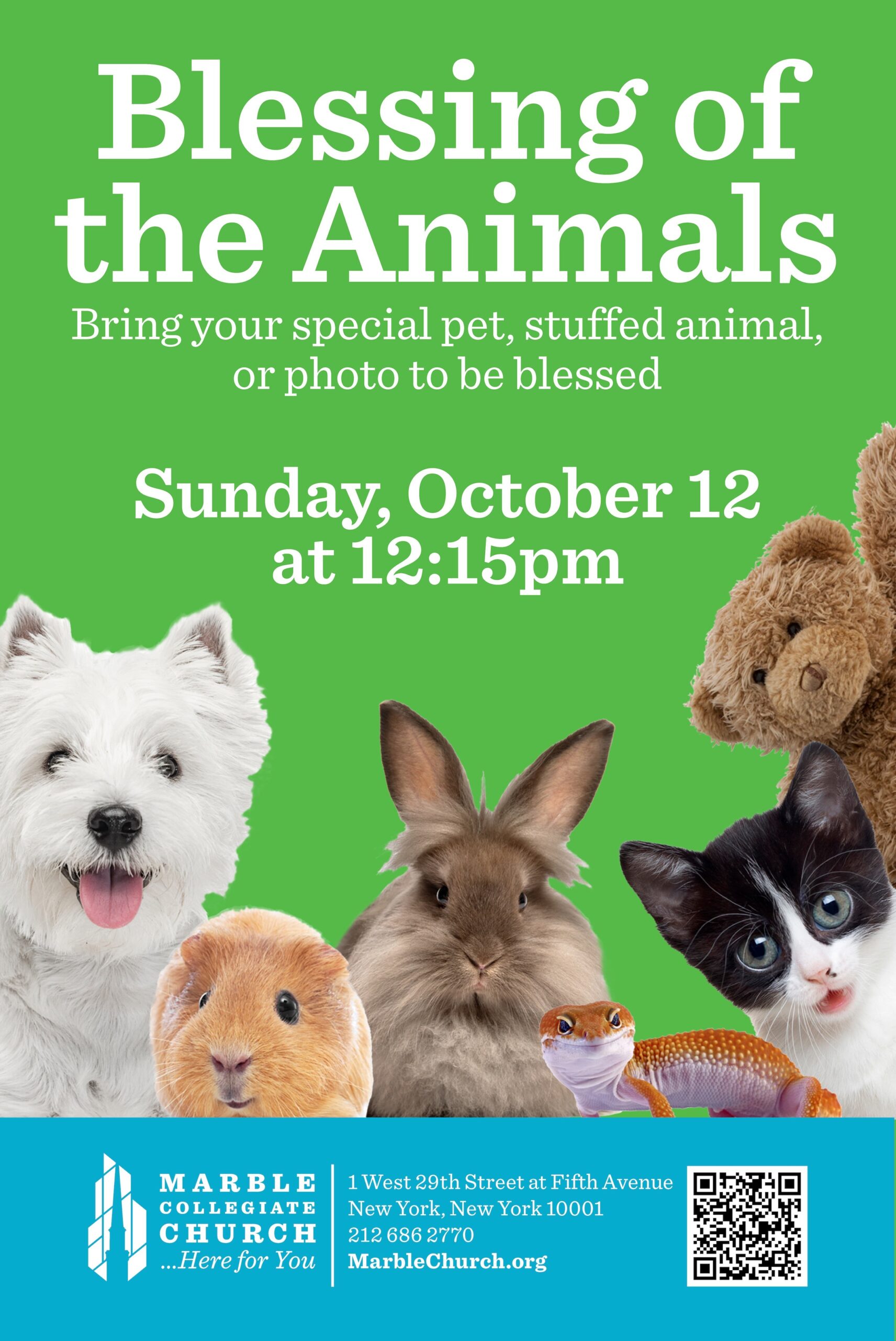 Cuddly and cute, or not, bring your beloved pets to Marble Collegiate Church’s annual Blessing of the Animals, Oct. 12 , 2025, at noon, on the Fifth Avenue steps of 1 W. 29th Street. Marble ministers will be on hand to bless all kinds of animals, including plush toy animals. If your pet doesn’t travel well, bring photos of them to be blessed. This festive, community-oriented event will take place immediately after the 11 a.m. service.